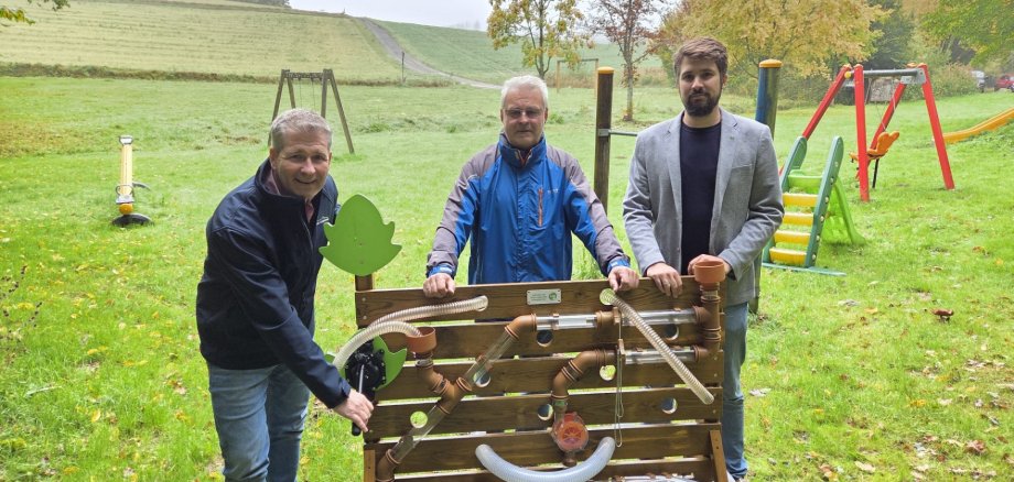 Spielen und bewegen an der frischen Luft ist gesund - das gilt für Kinder und Erwachsene gleichermaßen. Um für mehr Aktivität im Freien zu sorgen, fördert die EAM die Anschaffung und Aufstellung von Spiel- und Sportgeräten in den Kommunen ihres Netzgebietes. Darunter ist auch die Stadt Hessisch Lichtenau. Niklas Stüber, Leiter der Netzregion Hessisch Lichtenau, übergab gemeinsam mit Bürgermeister Dirk Oetzel eine Outdoor-Wasserwand an Harald Sennhenn, Mitglied des Ortsbeirats Quentel. Die Wasserwand bietet ab sofort ein faszinierendes Wassererlebnis für die Spielplatzbesucher in Quentel und fördert die kreative Betätigung mit dem Element Wasser.