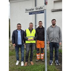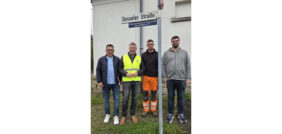 Bei der Montage waren Bürgermeister Dirk Oetzel, Sascha Stück (stellv. Leiter Fachbereich Tiefbau, Umwelt, Ver- und Entsorgung), Nico Wilhelm (stellv. Leiter Baubetriebshof) und Bastian Krengel (Fachbereich Tiefbau, Umwelt) dabei.